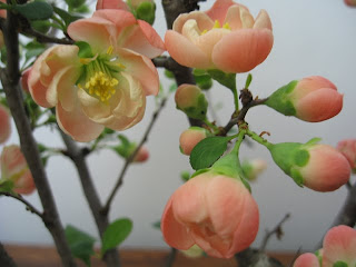 花形似海棠花.花梗短,乍看盛開的花朵全貼在枝幹上了,因此又有貼梗海棠的別名.